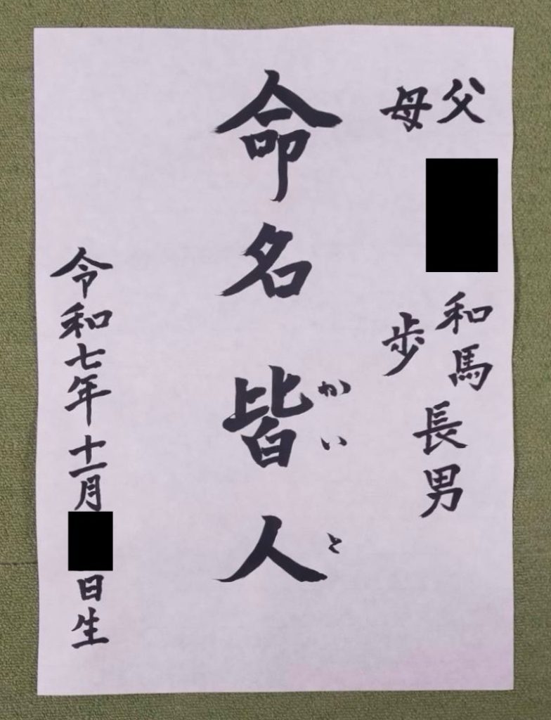 写真の命名書は先月出産した水野さん直筆の書です。(会員の玉手箱に出産報告済)出産した母親が自ら筆を持って我が子の命名書を書く。何と崇高な姿勢でしょう。その命名書が伝統に則った書式で品格のある筆跡なら将来子供は誇らしく思います。